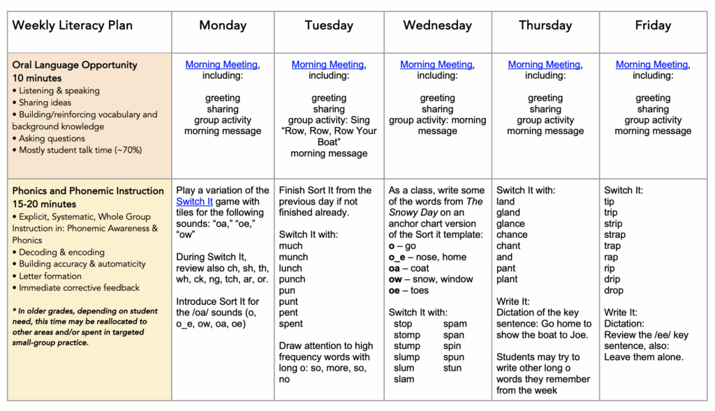 Here is a one-week plan I created for a Literacy block focusing on Reading skills at the lower elementary level (early Grade 2)